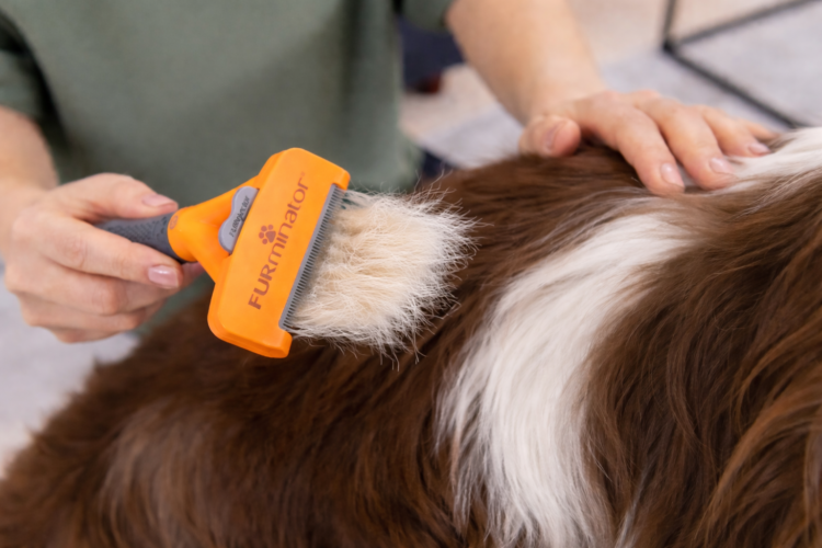 抜け毛がごっそり抜けているその瞬間をとらえている様子、毛がファーミネーターの歯にたまっている状態を見えるように。
