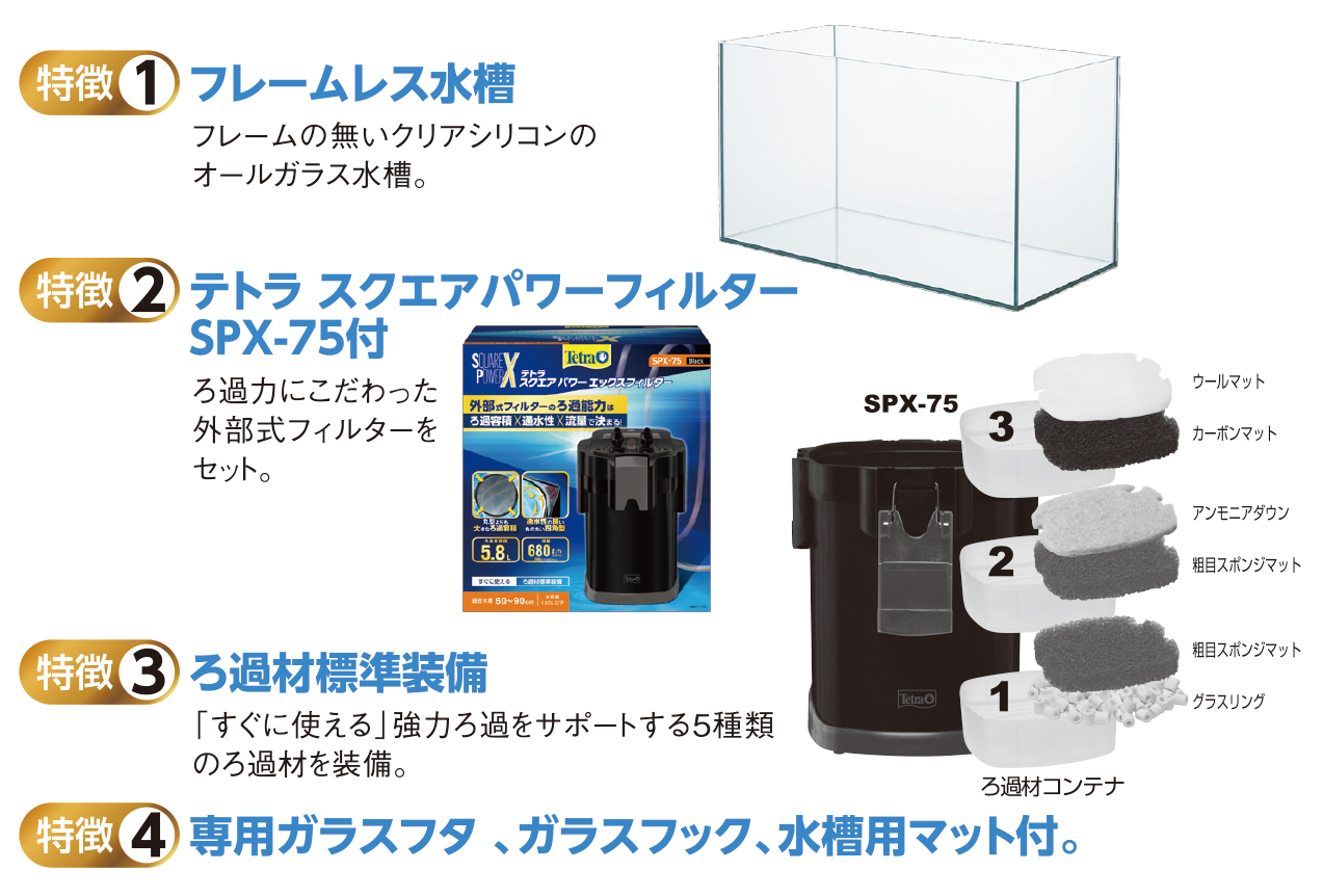 ●ろ過力にこだわった外部式フィルターのテトラ スクエアパワーフィルターSPX-75をセット。